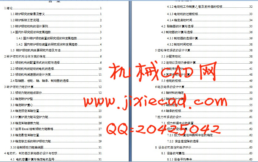 Tilting mechanism is to achieve one of the main steelmaking production equipment, which is characterized by a large dump Moment, gear ratio, starting and braking frequently and withstanding greater dynamic load. Converter tilting mechanism works in harsh working environments, more slag dust and high temperatures. Thus their reliability and longevity for the safe operation of the equipment throughout the converter has a very significant impact. Adaptation to obtain a low rotational speed of the drive requires a large reduction ratio. Great weight converter furnace, plus loading weight, etc., the entire weight of the part to be tilting up hundreds of tons or thousands of tons. BOF furnace steel smelting a time, usually only four minutes later. Converter tilting mechanical work belongs to "start working system." In addition to the basic institutions to withstand static loads, but also to withstand dynamic loads due to start, braking caused. This dynamic load in the mouth skimming operation, more than twice its value even to static loads. Kai, the amount of braking complex, dynamic cut withstand greater load. As the steelmaking process low, heavy and harsh working conditions, coupled with the start, brake frequently, especially on a different way to start the motor on the dynamic behavior of the converter. With the converter tilting BOF steelmaking machinery popularization and development also continues to develop and improve, there have been various types of tilting the device. With torsion bar stopper buffer full hanging tilting mechanical, diagonally arranged into four main transmission system of a reducer drive one at the center of the second gear, so as to drive the rotary converter work performed. This paper converter tilting mechanism gives a brief introduction. Introduction tilting mechanism structure, design principles, the basic design parameters, as well as several forms of structure and configuration of the drive tilting mechanism and the transmission format.摘 要