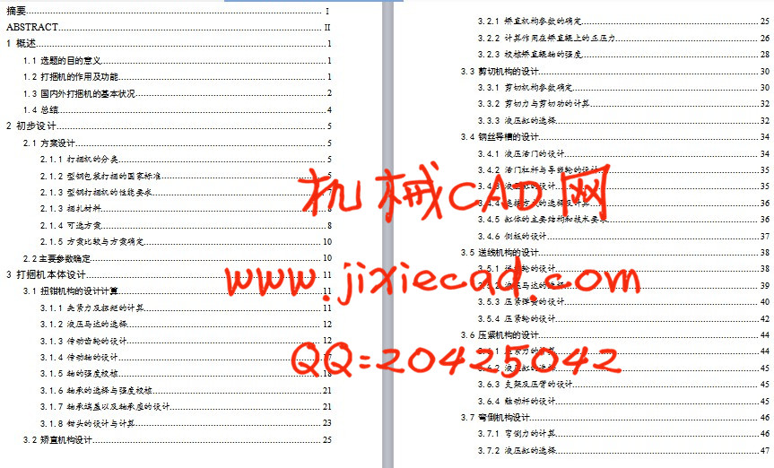 钢材包装打捆机是我国钢铁企业精整包装生产线的急需设备,而且是轧钢企业精整包装生产线的核心设备。特别是在现今钢铁行业不景气的情况下,各钢铁企业更需要进行技术革新来占领市场,提高自己的劳动生产率,降低自己的生产成本,才能在激烈的竞争中立于不败之地。因此开发研制符合我国需求的高性能的钢材包装打捆机及其配套设备是我国钢铁行业的迫切要求,具有重要的经济价值和现实意义。本论文通过对扭钳机构、矫直机构、剪切机构、钢丝导槽、送线机构、压紧机构、弯倒机构、液压系统等的逐步计算,基本完成了中型钢材全自动液压打捆机的设计。设计中涉及各零部件的参数计算、强度校核以及液压缸的选择极端等。本打捆机使用直径为6.5mm的钢丝可以完成对角钢、槽钢等中小型型钢的包装打捆,料捆尺寸350×350mm2。另外本打捆机全部采用液压驱动,降低了设备对环境的污染。并且提高了包装打捆的控制精度和速度。此打捆机的设计在我国打捆机发展落后的情况下有很重要的现实意义。关键词:全自动;液压驱动;型钢;包装