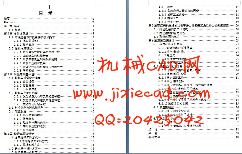 本次设计课题来源于江苏悦达专用车有限公司,主要根据总体结构设计的要求对垃圾车车厢和排出机构液压系统进行了设计。车厢是垃圾车的重要部件之一,主要起装载、运输垃圾之用。运输过程中,不良机构容易造成二次污染。根据设计要求,确定了厢体形状和主要尺寸参数,重点考虑它的密封性;排出机构主要是用来排卸垃圾以及在垃圾装载时提供一定的背压力,使压缩后的垃圾密度均匀;在设计过程中,首先计算液压缸的外部载荷,然后根据结果计算出液压缸的主要参数,进而一步步确定液压系统中其他元件的参数。