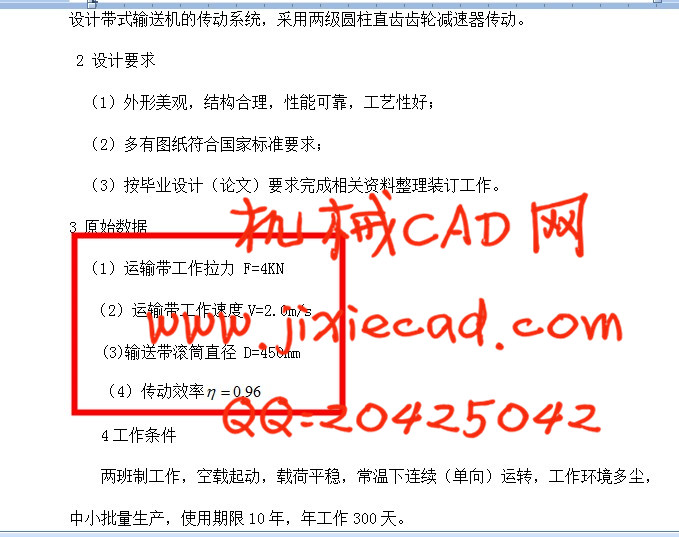 两班制工作,空载起动,载荷平稳,常温下连续(单向)运转,工作环境多尘,中小批量生产,使用期限10年,年工作300天。