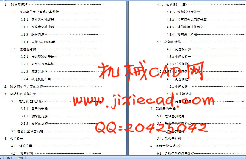 这次毕业设计主要介绍了减速器的类型作用及构成等,全方位的运用所学过知识。如:机械制图,金属材料工艺学公差等以学过的理论知识。在实际生产中得以分析和解决。减速器的一般类型有:圆柱齿轮减速器、圆锥齿轮减速器、齿轮-蜗杆减速器、轴装式减速器、组装式减速器、轴装式减速器、联体式减速器。