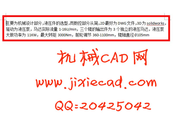 主要为机械设计部分,液压件的选型,而数控部分从简,2D最好为DWG文件,3D为solidworks,驱动为液压泵,马达实际流量1-16U/min,三个辊的输出件为3个独立的液压马达,液压泵大致功率为11KW,最大转矩3000Nm,前轮调节360-1100mm,辊轴直径