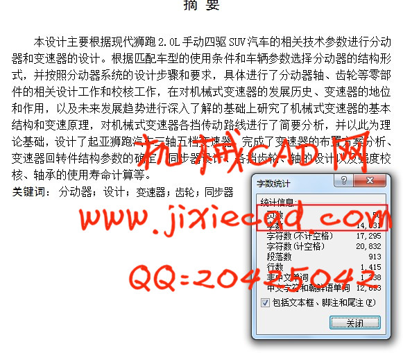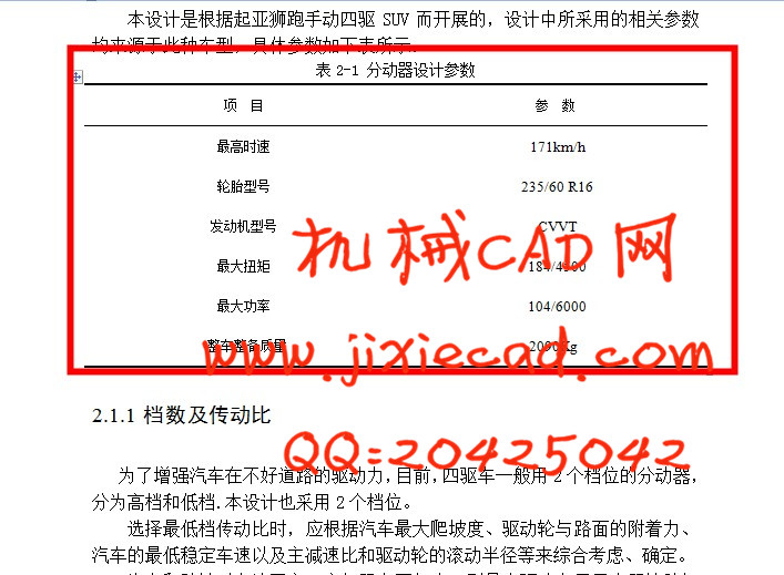 本设计主要根据现代狮跑2.0L手动四驱SUV汽车的相关技术参数进行分动器和变速器的设计。根据匹配车型的使用条件和车辆参数选择分动器的结构形式,并按照分动器系统的设计步骤和要求,具体进行了分动器轴、齿轮等零部件的相关设计工作和校核工作,在对机械式变速器的发展历史、变速器的地位和作用,以及未来发展趋势进行深入了解的基础上研究了机械式变速器的基本结构和变速原理,对机械式变速器各挡传动路线进行了简要分析,并以此为理论基础,设计了起亚狮跑汽车三轴五档变速器,完成了变速器的布置方案分析、变速器回转件结构参数的确定、同步器设计、各挡齿轮、轴的设计以及强度校核、轴承的使用寿命计算等。关键词: 分动器;设计;变速器;齿轮;同步器