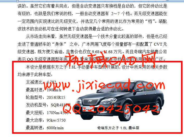 根据轿车的外形、轮距、轴距、最小离地间隙、最小转弯半径、车辆重量、满载重量以及最高车速等参数结合自己选择的适合于该轿车的发动机型号可以得出发动机的最大功率、最大扭矩、排量等重要的参数。再结合某些轿车的基本参数,选择适当的主减速比。根据上述参数,再结合汽车设计、汽车理论、机械设计等相关知识,计算出相关的变速器参数并论证设计的合理性。