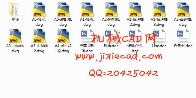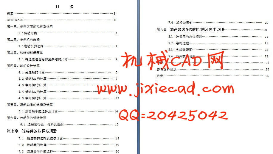 本文首先对设计方案进行了介绍;并介绍了电动机的选择方法、箱体的设计、轴的设计、齿轮的设计、键的选择等,然后简要介绍了减速器装配的一些相关知识及技术说明;最后列出了设计过程中翻阅及参考过的文献。