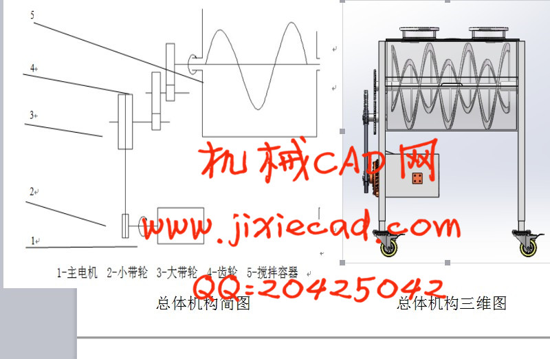 本文对卧式混合机的基本结构、基本尺寸进行了详细设计,并利用SOLIDWORKS对混合机结构进行三维建模,以便更直观地展现设计思想和进行结构分析;并对设计零件进行了分析校核,保证混合机的可靠运行。