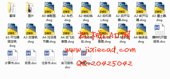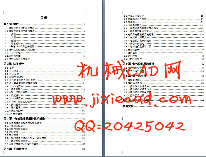 This design is applied mostly with the farms of the farmers ,they can also used to fertilize、abrade、get rid of grass and so on ,when we incress some equipment .My design introduce the structure of the seeding-machine and the types of many parts 、some request an fuction .My design introduce the drive equipment of the machine and the types of many parts 、request and fuction .My design also introduce the drive equipment of the machine and the request of the parts which consist of the selecting of the power 、the size 、the design of the axial 、chain wheel 、some other parts and so on .We must consider suiting well of the depth 、the row spacing 、the distance of scoop and the rate of seeds breaking up when seeding .In my design ,while thinking over applied ,I give attention to saving econmy ,consequently achieve structure in reason 、the cost of produce lowness 、the cost of power lowness 、the effidiency highness and convenient when operating .