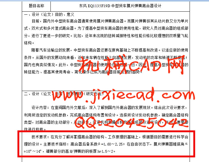 Automobile clutch gearbox is located between the engine and flywheel shell, with screw assembly will be fixed in the clutch after the plane of the flywheel, clutch gearbox output shaft is the input shaft. In the car, the driver can be down or release the clutch pedal, so that the temporary separation of the engine and gearbox, and the gradual bonding to cut off or transfer the engine to the transmission input power. At present, widely used in all kinds of cars on friction clutch is a moving part of the friction between the subordinate to transfer power and can separate device.This design is mainly to the medium truckloads of diaphragm type spring clutch on the design. According to the using conditions and vehicle parameters of vehicles, according to clutch system design steps and requirements, the basic parameters of the first choice, second to parts design: pressure plate, clutch cover, elastic transmission piece, separation device, and driven plate, driven plate and platen hub, operation, reverse design of the spiral spring shock absorber. According to various spare parts working conditions, and analyses the relevant respectively. Ensure that the design of the clutch can utmost transfer engine torque.