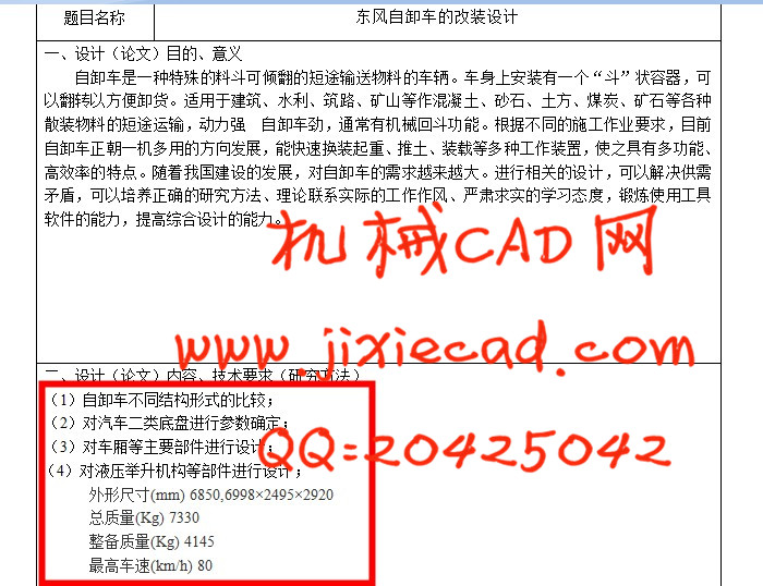 Dump truck, is also called the car to through the hydraulic or mechanical lifting and unloading goods to the vehicle. By dump of lifting mechanism of assembly, chassis, hydraulic system assembly, locking mechanisms assembly, big box of five large assembly. This design mainly contains the car, take the force, the hydraulic cylinder, the arrangement of the whole car, etc. Choose this topic full consideration of the research on vehicle engineering students to study and work guidance, can make us understand special automobile refitting design method, through this topic research we can complete theory course the practice, access to certain engineering design work methods and experience. Related design, can solve the contradiction between supply and demand, the research methods, cultivate correct theory with practice work style, serious realistic learning attitude, exercise the ability of tool use software, improve the overall design of the ability for us to understand this design has brought great benefits a., through the design we know the special structure of the form and lifting style and etc, to our knowledge later work to have the very big profit.Keywords: dongfeng skip; Equipments; Special vehicle; Special automobile design; Lifting mechanism; Hydraulic system;