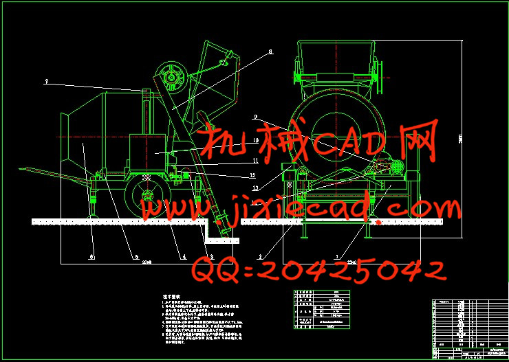 In order to meet the needs of different mixing, many models of the mixer have been developed. In this design, choose the type of the concrete mixer at first. Through comparing, the taper mixer which produces the material reversely is chosen for use. After the selecting the type, the transmission of the mixer is designed. Through calculating the tube of the mixer, the power of mixing can be confirmed at first. After choosing the electrical machinery, the reduction gear can be designed. This is an important part in this design. In the design of the reduction gear, reference information, and then calculate and design each part of the reduction gear according to the design step of the mixer. After finishing the design of the reduction gear, the opening gear wheel outside the mixing tube can be calculated and designed. This is a difficult point in this design, because that the transmission of this gear wheel is big. This problem is needed to well solve, and then the transmission of the mixer can be finished finally. Then the suitable shaft coupling can be chosen to link each part of the transmission well. After finishing the design of the transmission, the part of taking material is designed simply .The overall part of the concrete mixer is compounded out finally.