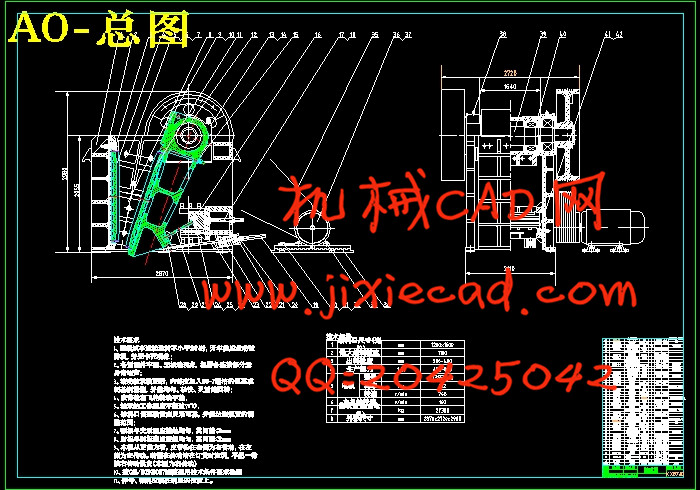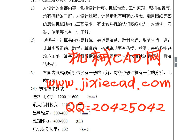 This design is done for:the feeding port size is 1200 x 1600mm; Maximum feeding granularity is 1100mm; Production efficiency is 400-800t/ h; Eccentric shaft speed is 160r/min; Discharging mouth adjustment range 300mm to 400mm; Motor power is 132KW. This design analysis of the current development of the crushier,the meanings of researching the crusher,how the dimensions of jaw crusher effect on the performance of the broken, calculate and determine the PE1200 x 1600 structure parameters, the design content mainly includes swing jaw, eccentric shaft, pulley, seing jaw gear plate, and settled jaw gear plate and frame and some other important components; In addition, jaw crusher principle and characteristics and main component function is introduced, including insurance device, adjusting devices and frame structure, lubrication device, etc.; Also on the machine parameters (spindle speed, production capacity, crushing strength, power) calculate as well. In addition, the significance of broken, crushing process and calculation of crushing ratio, jaw crusher main component installation, operation and maintenance are introduced.