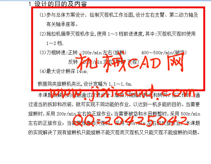 Design subject rotary tillage stubble cleaner overall for Model and transmission device design by the side, stem from production reality. Is it is it design to improve on the basis of ordinary horizontal rotary tillage machine mainly to design originally, make their can rotary tillage can is it recommend to kill also , in order to realize one machine multi-purpose. The main content designed is: Overall conceptual design , drawing the state job general drawing of the stubble-cleaning , designing by the side or middle gear system and one one hundred sheets of rollers axle .Design through improving, increase the rotational speed of the axle of one one hundred sheets of rollers and change direction. While working, through proper dismantlement and repacking , can realize the homework of different functions , in order to be up to a machine multi-functional purpose .