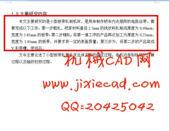 文中主要论述了小型板带轧制机床总体方案的确定过程,电机功率和轧辊的计算过程以及轴的校核过程。
