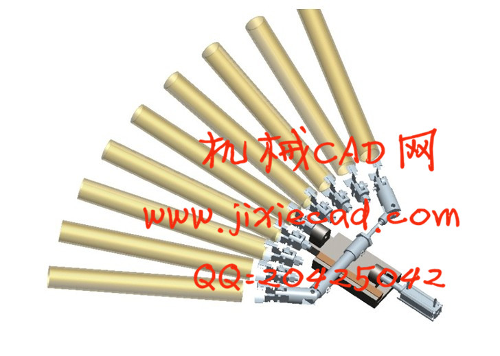 花炮筒扇形排布穿引机可实现花炮筒的扇形排布、涂胶、穿引等工序,其主要由四部分组成:扇形排布机构、打孔穿引机构、涂胶机构、堆砌机构。扇形排布机构部分是实现花跑筒固定并且呈扇形排布的机构,主要通过弹性元件变形实现均匀扇形;打孔穿引机构是通过气缸实现在花炮筒底端打孔,同时将引线勾入炮筒的机构;涂胶机构是采用胶箱、涂胶滚筒实现在花炮筒筒体涂胶的机构;堆砌机构是将已排的扇形花炮筒堆砌,形成扇形筒堆。为传统烟花鞭炮生产提供了一种可用的自动扇形排布穿引机。