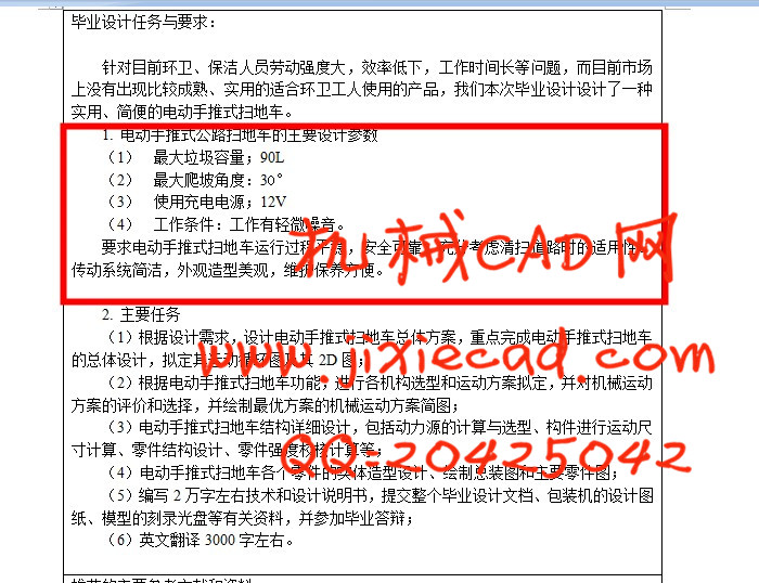 针对目前环卫、保洁人员劳动强度大,效率低下,工作时间长等问题,而目前市场上没有出现比较成熟、实用的适合环卫工人使用的产品,我们设计了一种实用、简便的电动手推式扫地车。该扫地车可以对路面,广场等较平坦的场地进行快速,高效的清扫,而且不需要其它动力,具有较强的适应性。我们在车上设计一个多排毛刷的滚筒配合一个大半个圆的弧形铲子可以将垃圾迅速扫起,只需扫地车前进这一个动作即可实现对地面垃圾的收集清扫工作。垃圾车上还设计有移动滑块可实现调节万向轮的高度,同时控制滚筒与地面离合两个动作,可以使扫地车在不清扫时使滚筒离地同时关闭电源实现滚筒和带轮离合,这样方便使用者在不用的时候轻松移动扫地车。车轮上还有万向轮的调高,可随意的后退而不带到垃圾,实现多次清扫。而在垃圾特别多的时候,车上的压缩装置可以增加扫地车的装载量,进行更持久的清扫。【关键词】:电动手推式扫地车、滚筒、毛刷、万向轮、离合