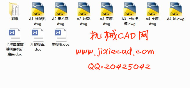 The hemispherical spiral groove muller is one kind of special numerical control mulling equipment which has higher efficiency, higher degree of accuracy, lower cost and automate procedures. The grinding head mentioned in this design is the major component of the hemispherical spiral groove muller, which can be used to realize cutting procedures of the grinding wheel. And if it connects with work spindle headstock and swiveling table according to the request of processing workpieces,it can realize the processing of the hemispherical spiral groove. This design uses spring chuck to install the grinding wheel, and uses bolt to adjust the situation of spindle headstock, and uses compression spring mechanism to adjust the mulling pressure. Also the design uses the direct current electromagnet and proximity switch to realize “lifting knife”, and uses asynchronous machine to drive. This design has the features of the simple structure, the reliable operation and the lower cost. And this design also has comprenhensive applicable prospects.