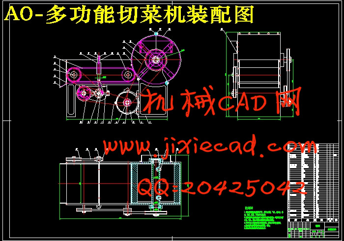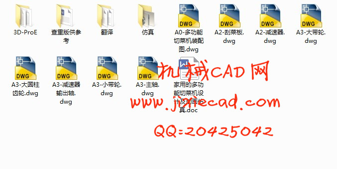 本次设计的切菜机主要由外壳体、竖直切菜机构、离心切菜机构、电机底座、带传动、齿轮系等组成。在本次设计过程中,首先调查分析了切菜机的研究现况及工作原理,在此基础上提出总体设计方案;接着,对各机构主要零部件进行了详细的设计;最后,采用AutoCAD绘图软件绘制了本家用多功能切菜机的装配图及主要零部件图,并且采用Pro/E构件了三维模型及仿真模拟。