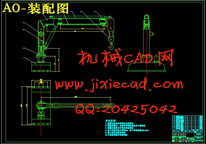 设计出一种起吊重量在3吨以内、起重高度在3米以内、起吊臂可在2.5—4m范围内伸缩变化、调臂可在00-600范围内变幅,整个起吊装置安装在载重汽车上,实现对货物在载重汽车上的上下搬运的一种简易起重机械。