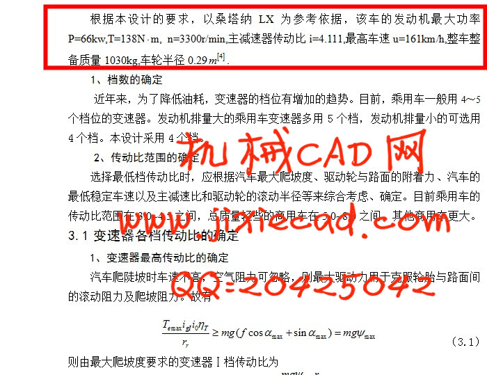 本设计针对乘用车两轴式机械变速器。根据乘用车的外形、轮距、轴距、最小离地间隙、最小转弯半径、车辆重量、满载重量以及最高车速等参数,结合选择的适合于该乘用车的发动机型号可以得出发动机的最大功率、最大扭矩、排量等重要的参数。结合某些乘用车的基本参数,选择适当的主减速比。根据上述参数,计算出变速器的相关参数,进行合理性的设计。
