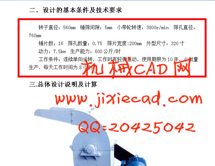 转子直径:560mm 锤筛间隙:5mm 小带轮转速:3800r/min 筛孔直径:760mm