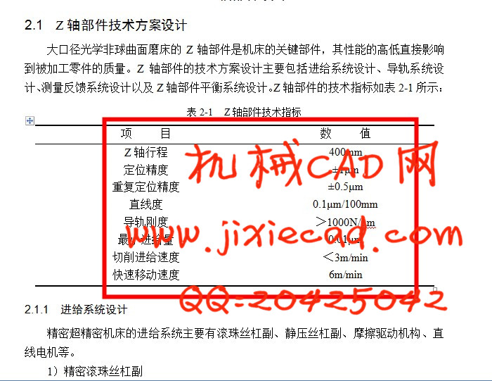 通过本课题,设计一台可满足大口径高精度轮廓测量的Z轴精确进给,主要技术要求如下:⑴Z轴行程:400mm;⑵导轨刚度:>1000N/um;⑶砂轮轴中心线至转台台面距离:180mm;⑷电机功率:8kw; ⑸额定扭矩:12NM; ⑹定位精度:±1um; ⑺重复定位精度:±0.5um;⑻最小进给量:0.01um;⑼快速移动速度:6m/min;⑽切削进给速度:<3m/min>。