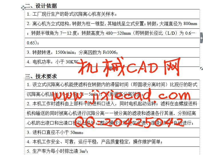 摘要:本文介绍了800型立式沉降离心机的性能参数、结构原理和分析、转鼓的设计计算、轴设的设计计算及校核、斜齿轮的设计计算以及设计来源。800型立式沉降离心机是以工厂现行生产的卧式沉降离心机有关样本为基础设计出的新型沉降离心机。 800型立式沉降离心机可以克服现行螺旋卸料沉降离心机占地面积(或体积)大和现在常用的两种差速变速器(有摆线针轮行星变速器和双级2K-H渐开线齿轮行星变速器)结构复杂,价格昂贵等缺点, 并且该立式沉降离心机能使滤料在转鼓内的滞留时间(即固液分离时间)比现行的卧式沉降离心机延长10~15倍(1—5min),从而提高了分离效果。 该立式沉降离心机 工作可靠,运行平稳,产品质量稳定,操作维护简单,噪音小;对物料适应性好,结构紧凑,其进料口、出液口和出渣口便于连接到生产自动线上等优点。整个操作过程是在全速、连续运转下自动进行。它的生产率为每小时排出3