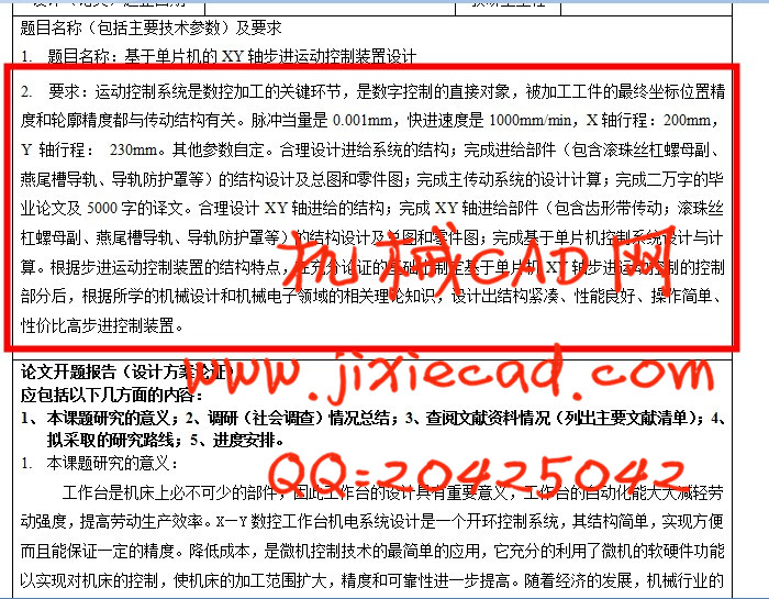 XY table, controlled by microprocessor system, can be designed as open-loop, semi closed-loop and closed loop servo system. This design uses the open-loop servo system. Stepper motor, driven by the SCM controlling system drives the motion table by the drive mechanism. For mechanical design, it is the first step to design the worktable and select the guide pairs by the maximum load under the table. Later for structural design、stress analysis, and the torque calculation, draw the table assembly sketches. Then select the type stepping motor, and design the ball screw. Complete designing the XY table, and drawing the assembly drawing finally.