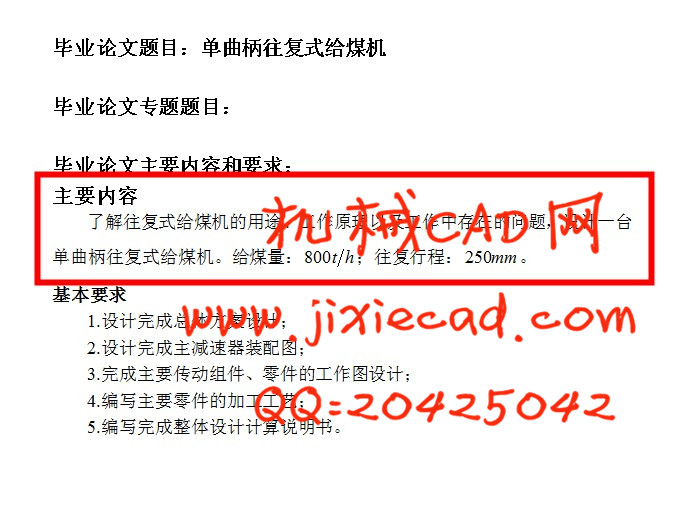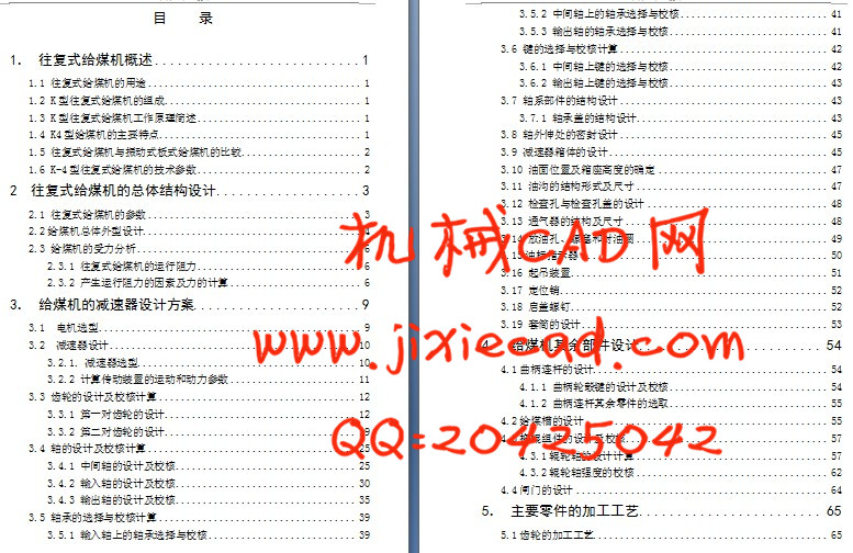 The design specification is: first through the design calculations for coal is the main moving parts to the coal shafts running speed and suffered the motor running resistance to achieve power. To the final design of coal chassis, transmission platforms, such as auxiliary components. Coal-to finalize the overall assembly. Reciprocating in this coal to the design process, focusing on reducer, transmission platform, crank linkage, Idler for the analysis and design. Important components of the stress analysis, strength check, in accordance with its common failure mode, Factors and basic design requirements, is an important component of the stress analysis, strength and stiffness of the design method.