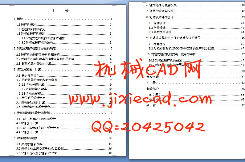 本次设计对辊式破碎机的辊齿,齿辊轴等部分做了详细设计,使破碎机装卸方便、维护简单、维修容易,以便能利用破碎机更好的工作,发挥辊式破碎机的特点。
