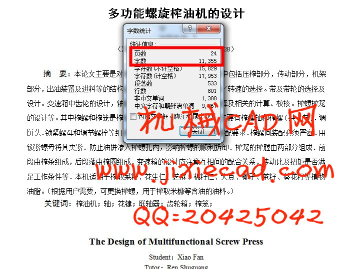 Abstract:This paper is the overall structure design of screw press. Including press parts, transmission parts, chassis parts, the structure design of oil device and feed etc.. Including the motor input power / speed selection. The selection and design of belt and pulley. Transmission in gear design, shaft design, bearing, bond, options and related coupling calculation, checking. Screw squeezing cage design etc.. The screw and barrel is the main component of oil press. Screw mainly consists of a screw shaft and screw. Adjustable cake head. The lock nut and an adjusting bolt etc.. Design should meet the requirements of the press screw assembly screw the screw assembly must be strict. Through a locking nut clamping. Prevent the cake into the pressing screw effects of screw, the smooth demolition. Pressing cage pressing chamber consists of two parts. Section by pressing strip, after paragraph by the pressing ring. Attention should be paid to coordination between design of gearbox, whether the transmission ratio and torque to meet the conditions.