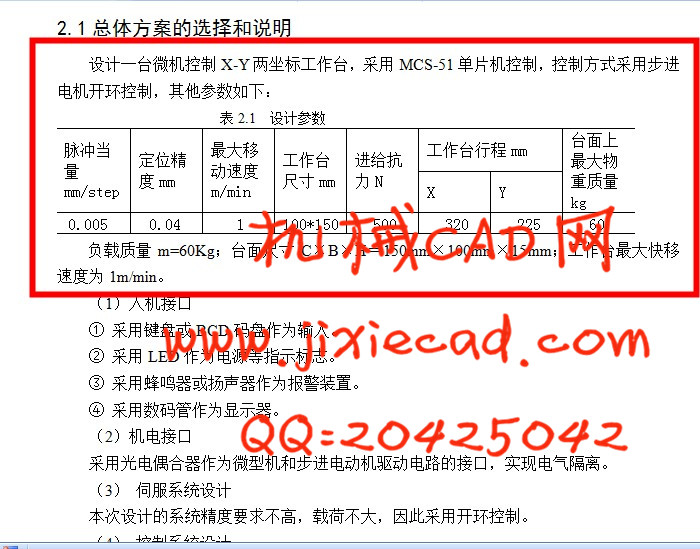 SCM control of the XY table system can be designed for the open-loop, semi-closed-loop system and closed-loop servo three. I design is open-loop servo systems using the stepper motor driven by the stepper motor control microcontroller-driven, driven by the transmission mechanism dynamic table of the campaign. System is not detecting device. Mechanical structural design of the first table under the maximum load, select the rails of the design table, and then the structural design, mechanical analysis, torque, the assembly table to draw the draft, then select the type stepper motor, thereby Design choices ball screw, the final design XY table, draw their assembly.