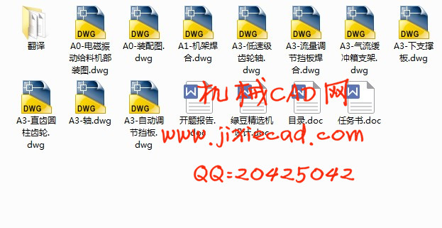 本课题是受黑龙江省粮食厅委托为其下属粮食加工企业设计开发的设备—绿豆精选机。该设备是粮食精加工系列设备的主要设备之一,可提高绿豆质量。通过该课题的研发工作,使学生能够正确运用所学课程的基本理论和有关知识,学会设计方案的拟定、比较、分析及进行必要的计算, 提高学生应用工程技术设计手册、标准以及编写文件的能力。在这样的背景下,本次毕业设计针对粮食豆类加工精选的这个主题,参考各种设备资料,并利用AUTOCAD等现代工具软件,进行了粮食豆类精加工生产线中的绿豆精选机的设计,其技术指标达到7-8吨/小时的生产率和98%的分选精度。相比起传统筛选方法,这种基于风选原理进行作业的粮豆加工机器在机械化、加工精度以及自动化程度等方面都大大提升。从而极大地提高了粮食精加工产品的产量和质量。