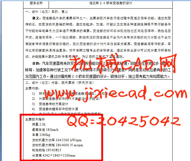 首先要选择发动机型号,确定发动机的最大功率、最大扭矩、最高转速等重要参数,然后根据上述参数选择最大及最小传动比,合理分配各挡传动比。结合运用汽车设计、汽车理论、机械设计、机械原理等知识,计算出变速器各个齿轮及轴的参数并校核其强度,论证设计方案的合理性,最后要画出变速器齿轮和轴的零件图。