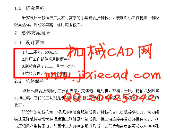 摘 要:本文在分析制粒机的结构组成和工作原理的前提下,介绍说明了小型复合肥滚压式制粒机的设计原则和设计步骤。并根据设计原则的要求,首先选择了小型复合肥滚压式制粒机的类型,确定复合肥滚压式制粒机的环模参数、传动型式、转速,等选择。然后具体设计复合肥滚压式制粒机的传动装置——包括变速箱的结构设计、皮带相关机构设计、关键零件的强度校核、支撑架和工作部件总成的设计。其中环模的设计是本次设计中的主要内容,它包含了大量的工作:资料的整理,参数的设定,相关计算,绘图等。