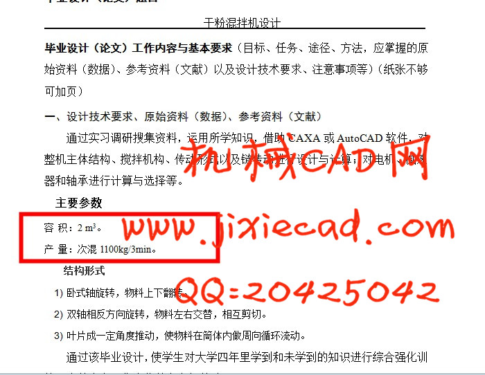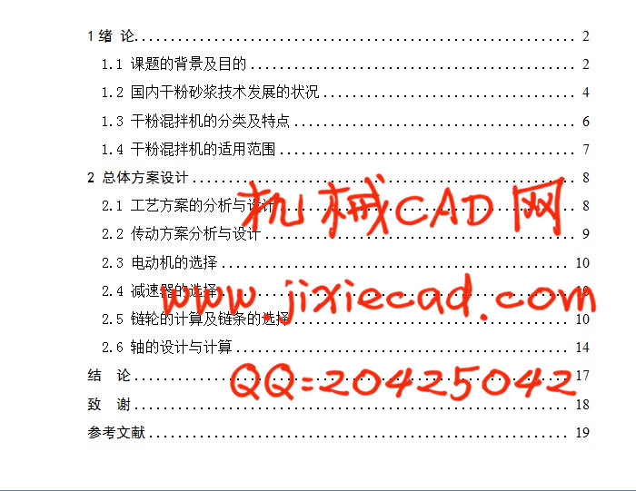 本设计通过对干粉混拌工艺分析,确定了无重力双轴干粉混拌机设计方案。根据设计参数,选择了电动机,对主要结构进行了详细地设计,并对位置调节机构、联接机构等也进行了简单地设计。