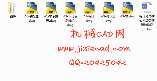 Through the search transmission relevant data, understand its mechanical separating cone type variator basic transmission principle. First known parameter is given out the transmission main parts steel ring and master-slave cone rounds of relevant sizes, and then based on the data already calculate and coordinate relationship with selected its main original bearing type, then determine the length and size cone wheel paragraphs. Then the Lord and driven shafts design and check. According to the size and axes and shaft with relationship of cone round to determine the relative size, through the key of various sizes determined accessible handbook with tolerance. According to the speed range speed operators, and then design by the stress of the above all parts assembly design requirement for cabinet relationship and the basic sizes and bearing housing. Then through strength check to determine whether meet the required strength all parts. The size of each parts according to the design with AutoCAD draw pictures out, according to the assembly drawings main transmission component parts graph. Finally completed the design specification.