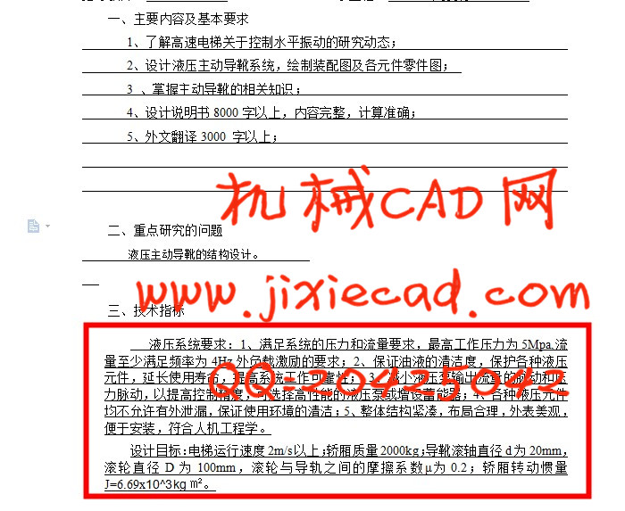 With the advances in civil engineering technology and multi-building highdemand, high-rise buildings is an essential symbol of city. The use of high-rise buildings without elevators that transport for the elevator speed and other performance and technicalindicators are constantly improved.The graduation project for high-speed elevator that occurred during the operation caused by the vibration envelope life, safety and comfort requirements of some of the problems, there has been the use of international and domestic is in its infancy some design ideas and applications, As the design of its contents; initiative to design a hydraulic elevator guide roller, in order to achieve the level of the elevator active vibration damping. Elevator elevator guide rail vibration is largely due to the straightness and parallelism error between the rails. Via the vibration damping to make the elevator to a safe operating range and reduces the body vibration frequency range permits sensitive label.Guide roller hydraulic actuators, hydraulic active force to change the size of this new high-speed switching valve to adjust the hydraulic control valve. Design hydraulic systems equipment and piping, and pressure to calculate the hydraulic components of standard parts selection.The design issues to avoid foreign patents, research active hydraulic elevator guide roller, the level of high-speed elevator active vibration control, the domestic elevator industry will be of great.