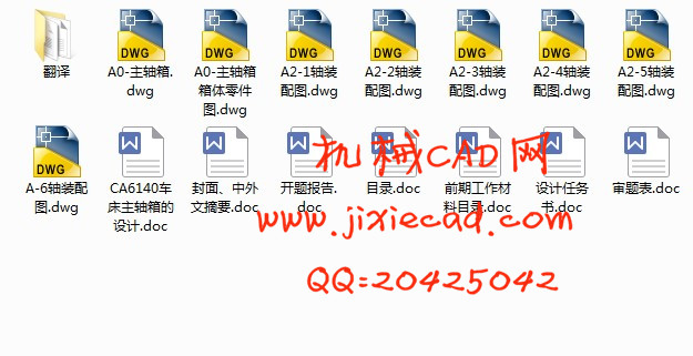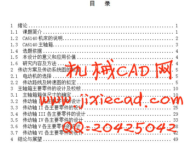 本文首先介绍了金属切削机床的基本概念,以及在国内外的发展现状。其次具体阐述CA6140车床主轴箱的功用,组成及各部分特点。然后根据课题的要求及给定的设计参数,对CA6140车床主轴箱的主传动系统进行了方案设计。最后文章分别对主轴箱中的各轴,以及轴上的齿轮和轴承进行了详细的计算和校核,并给出了各轴的装配图和主轴箱的总装配图。
