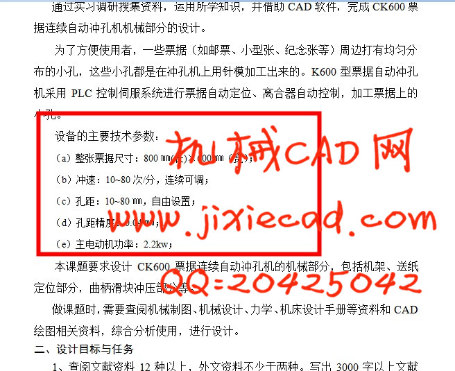 本课题要求设计CK600票据连续自动冲孔机的机械部分,包括机架、送纸定位部分,曲柄滑块冲压部分等。