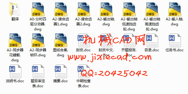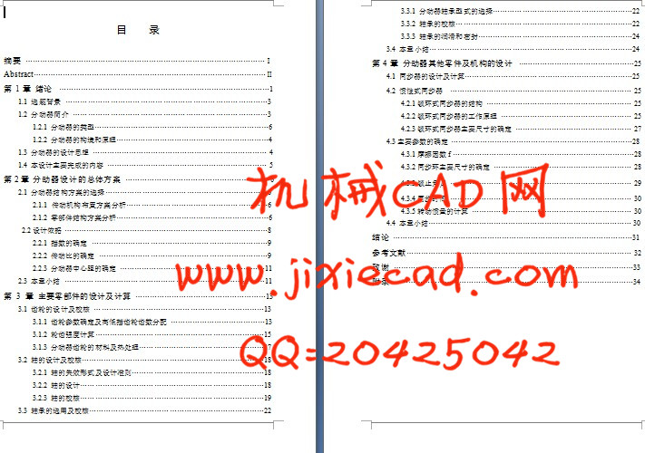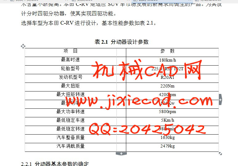 本设计根据匹配车型的使用条件和车辆参数选择分动器的结构形式,并按照分动器总成的设计步骤和要求,对其主要零部件,如齿轮、轴进行了相关的设计工作和校核工作。并根据汽车设计、汽车理论、机械设计、机械设计课程等参考资料提供的相关知识,对计算出的分动器具体参数进行检验,并论证设计的合理性。最终,用AutoCAD软件完成分动器二维装配图和零件图的绘制。