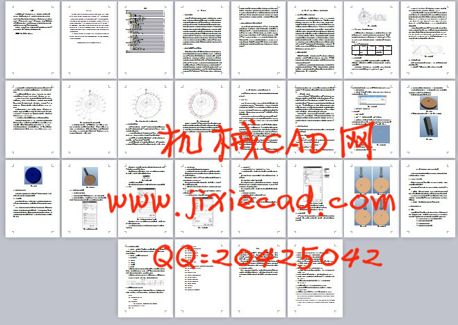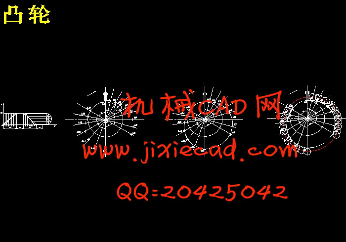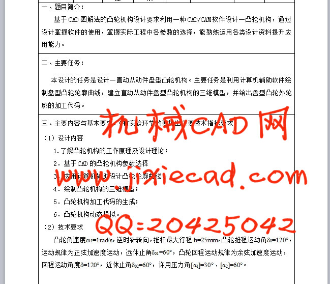 Based on the design requirements: cam angular velocity ω1 = 1rad / s, CCW, putting stroke h = 25mm, Cam-drive sports angle δ0 = 120 °, the movement of sinusoidal acceleration motion, far angle of repose δ01 = 60 °, the return movement of the cam cosine acceleration motion, the return movement angle δ = 120 °, near the angle of repose δ02 = 60 °, the allowable pressure angle [α1] = 30 °, [α2] = 60 °. Using AUTOCAD software to design a work profile plane cam use graphical method. Then based on the cam curve AUTOCAD software to draw the outline of a three-dimensional model created in three-dimensional design of the cam mechanism in PROE software.