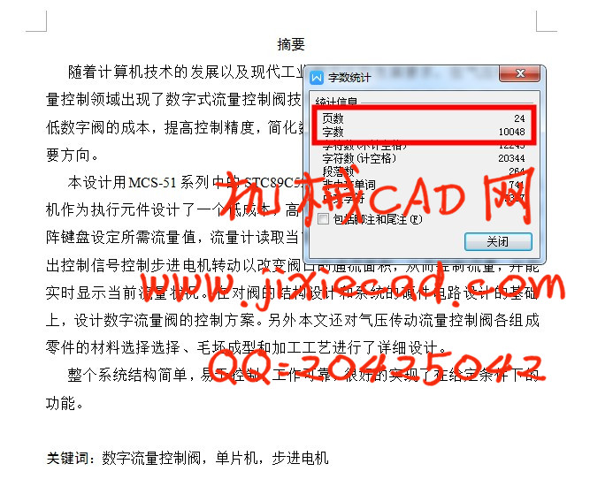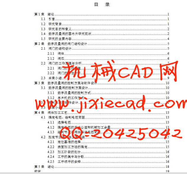 本 设 计 用 MCS-51系 列 中 的 STC89C52RC单 片 机 作 为 控 制 核 心 , 以 步 进 电 机 作 为 执 行 元 件 设 计 了 一 个 低 成 本 , 高 可 靠 性 的 增 量 式 数 字 流 量 阀 。 通 过 矩 阵 键 盘 设 定 所 需 流 量 值 , 流 量 计 读 取 当 前 管 道 流 量 , 经 过 单 片 机 的 处 理 , 输 出 控 制 信 号 控 制 步 进 电 机 转 动 以 改 变 阀 口 的 通 流 面 积 , 从 而 控 制 流 量 , 并 能 实 时 显 示 当 前 流 量 状 况 。 在 对 阀 的 结 构 设 计 和 系 统 的 硬 件 电 路 设 计 的 基 础 上 , 设 计 数 字 流 量 阀 的 控 制 方 案 。 另 外 本 文 还 对 气 压 传 动 流 量 控 制 阀 各 组 成 零 件 的 材 料 选 择 选 择 、 毛 坯 成 型 和 加 工 工 艺 进 行 了 详 细 设 计 。