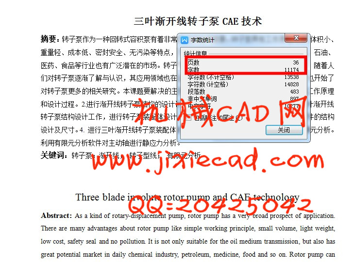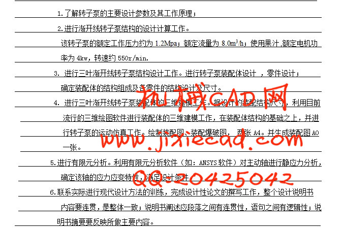 摘要:转子泵作为一种回转式容积泵有着非常广泛的应用前景。转子泵具有工作原理简单、体积小、重量轻、成本低、密封安全、无污染等特点,不仅适用于油液介质输送,而且在日用化工、石油、医药、食品等行业也有广泛潜在的市场。转子泵还可以在部分场合可替代螺杆泵及离心泵。随着人们对转子泵逐渐了解与认识,其应用领域也在逐渐的扩大。随着对转子泵的应用的增多,也开始了对转子泵更多的相关研究。本课题要解决的主要问题:1.了解转子泵的主要设计参数及其工作原理和设计过程。2.进行渐开线转子泵结构的设计计算工作及转子型线方程的确定。3. 进行三叶渐开线转子泵结构设计工作,进行转子泵装配体设计,零件设计;确定装配体的结构组成及各零件的结构设计及尺寸。4. 进行三叶渐开线转子泵装配体的三维建模,以及运动仿真工作。 5.进行有限元分析。利用有限元分析软件对主动轴进行静应力分析。