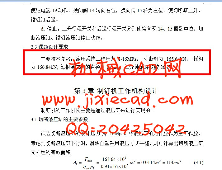 本设计是通过对五金制钉机工作原理、工作的环境和工作的特点进行分析,并结合实际,在进行细致观察后,对五金制钉机的整体结构进行了设计,对组成的各元件进行了选型、计算和校核。本文设计的五金制钉机主要技术参数:液压系统工作压力8-16MPa; 切断剪力165.64kN; 镦粗力166.84kN; 每根金属线的直径为1.6mm, 每分钟循环次数86次。经过设计完全满足任务书的课题要求。