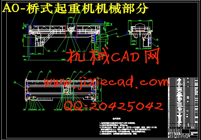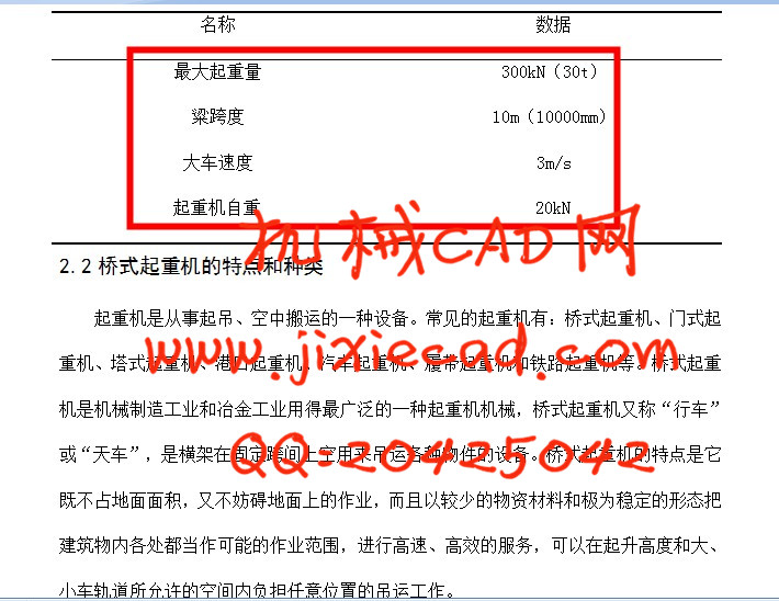 A bridge from the bridge crane, crane traveling mechanism, the car run institutions and electrical equipment. The traditional layout of the typical structure is adopted in the design of the whole system, bridge crane is a significant increase labor productivity goods handling equipment, primarily to carry goods workshops, equipment installation and maintenance, etc.. Hoisting pulley group adopts double pulley block, weight no horizontal movement in the process of lifting, hoisting process is stable, and the steel wire rope installation and easy replacement. Winding installations in the corresponding single reel, a large area of contact with the rope, the advantages of low pressure units. In the lifting mechanism also involves rope, reducer, coupling, motor and brake the choice.Keywords: hoisting mechanism of crane traveling mechanism; bridge crane;目录