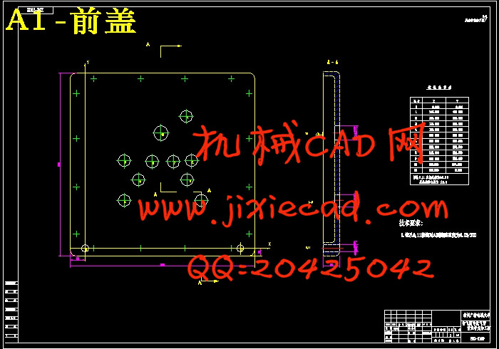三、齿面孔:2-Ф8.5深24;8-Ф6.7深20;飞面孔:5-Ф12.5深30;4-Ф6.7深20;所有孔表面粗糙度12.5。