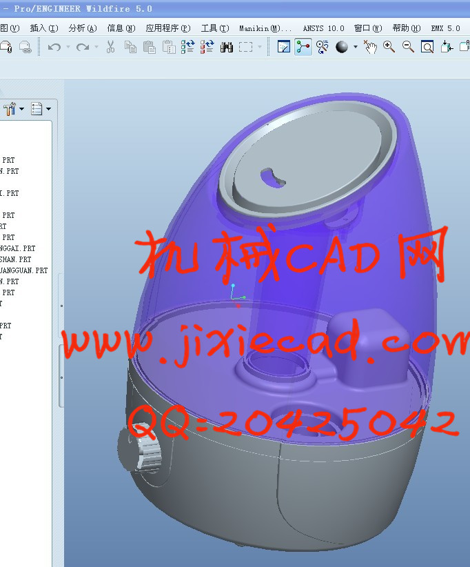 利用三维软件,综合运用所学的基本理论、基本知识和相关的机械设计专业知识,完成加湿器的结构设计及特定零件的模具设计。主要内容包括加湿器主题元素的确定、运用Pro/Engineer对产品进行造型、产品渲染、某个零件的模具、运用CAD结合Pro/Engineer绘制加工图纸、设计总结。关键词:Pro/E CAD 结构设计 模具设计 加湿器