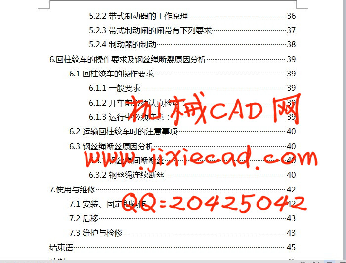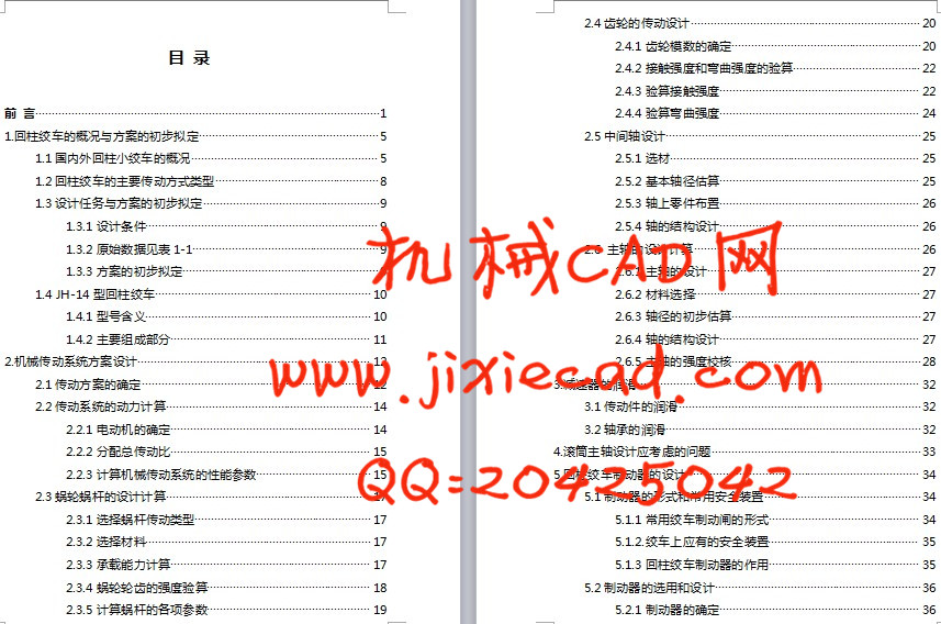 这篇毕业设计的论文主要阐述的是一套回柱绞车传动部分的设计方法,主要包括蜗轮蜗杆减速装置、直齿圆柱齿轮传动、轴承和传动件的润滑系统,还包括制动装置的选用、一部分常见故障的分析以及日常的使用与维护等。
