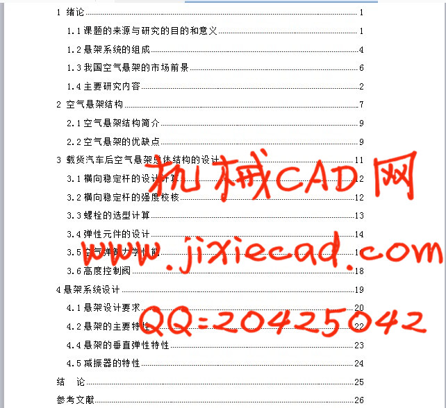 1 绪论 1Suspension is an important modern automobile assembly of, it is the frame and axle elastic connected. Its main task is transmit the role of the wheel and the frame (or the bearing body) between the force and torque, and easing the rough road surface to frame (or the bearing body) of the impact load, caused by impact load of bearing system of vibration attenuation, to ensure that the vehicle's normal running. This text is to carry on the design of the main and auxiliary spring of the truck rear suspension and check the design result to ensure that the design meets the requirements of the safety of the car. The topic of this graduation design is a truck rear air suspension assembly design, through the design of a truck rear air suspension assembly, to understand its structure and working principle, and the optimization, makes the design of truck rear air suspension assembly structure more reasonable and more secure.