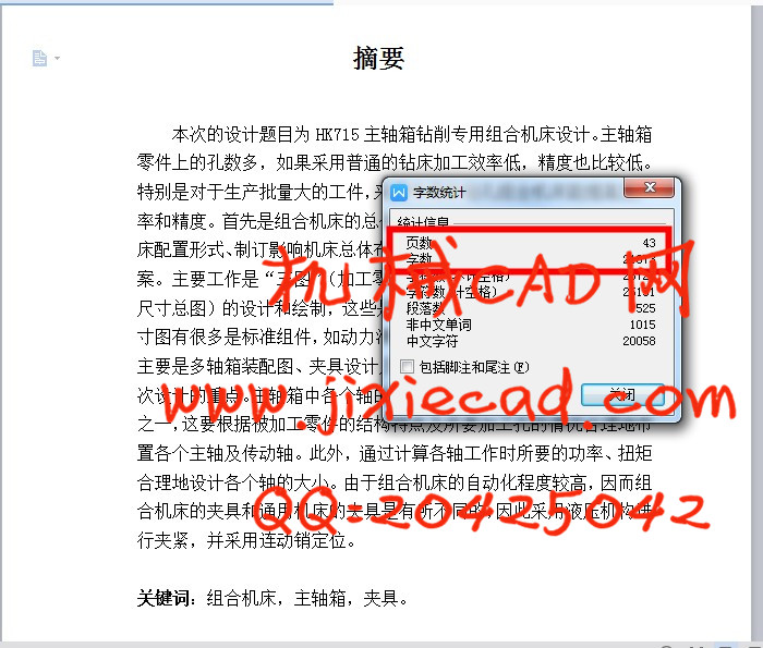 本次的设计题目为HK715主轴箱钻削专用组合机床设计。主轴箱零件上的孔数多,如果采用普通的钻床加工效率低,精度也比较低。特别是对于生产批量大的工件,采用专用的钻孔组合机床能提高生产率和精度。首先是组合机床的总体设计,包括制定工艺方案、确定机床配置形式、制订影响机床总体布局和技术性能的主要部件的结构方案。主要工作是“三图”(加工零件工序图、加工示意图和机床联系尺寸总图)的设计和绘制,这些是组合机床设计的基础。机床联系尺寸图有很多是标准组件,如动力滑台、侧底座等。再来就是技术设计,主要是多轴箱装配图、夹具设计及其装配图。机床多轴箱设计,是本次设计的重点。主轴箱中各个轴的选择和分布是最为关键的也是难点之一,这要根据被加工零件的结构特点及所要加工孔的情况合理地布置各个主轴及传动轴。此外,通过计算各轴工作时所要的功率、扭矩合理地设计各个轴的大小。由于组合机床的自动化程度较高,因而组合机床的夹具和通用机床的夹具是有所不同的,因此采用液压机构进行夹紧,并采用连动销定位。